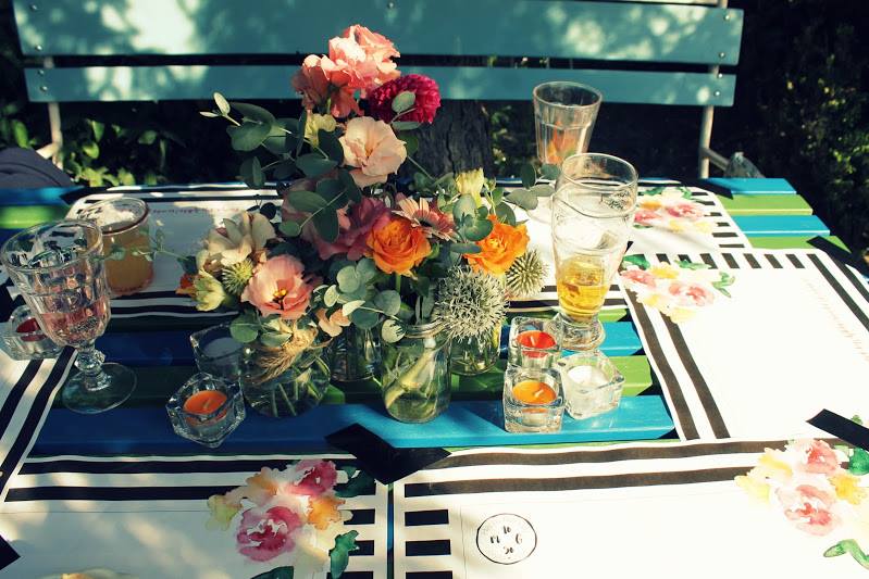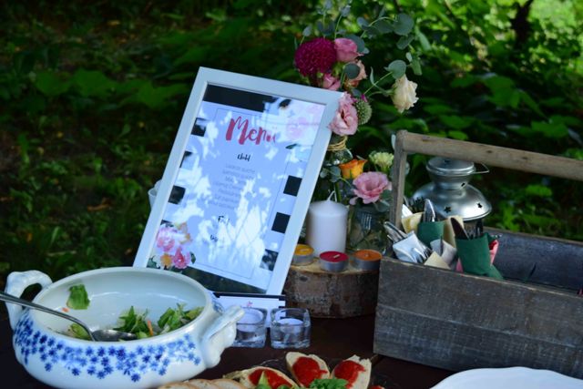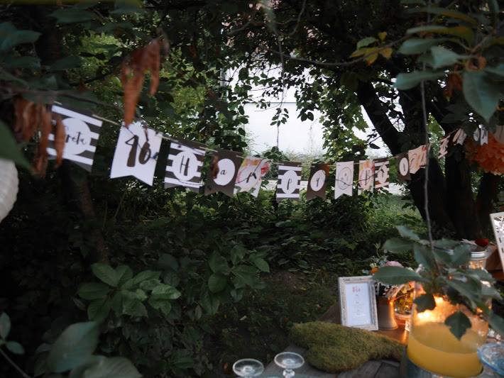 Készítettem még tányéralátéteteket a légiesen könnyű kis francia kerti bútor asztalaira, Happy Birthday zászló girlandot, melyek a fák ágai között lengedeztek. Az étlap és itallap is persze ebben a designban készült, illetve a menükártyák is a fantasztikus ételekhez, melyet így utólag is nagyon szépen köszönünk Máténak, EtyekM.