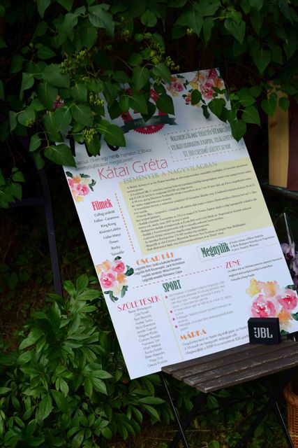 Zene: két héten keresztül válogattunk a nekünk oly kedves, régi emlékeket idéző zenéket, pl. az építőtáborban erre a zenére keltettek minket... Beleástuk magunkat a 70-90-es évek nagy válogatásaiba, slágereibe. Ismeritek a Spotify alkalmazást? Egyszerűen beleszerettem! Közel 400 dalt válogattam össze, és este csak rá kellett csatlakoztatnom a telefonomat a bluetoothos mini hangszóróra, és egész este mentek a szuper slágerek. A vendégeknek utólag nyilvánossá kellett tennem a playlistet, mert nagyon bejött nekik is.