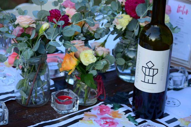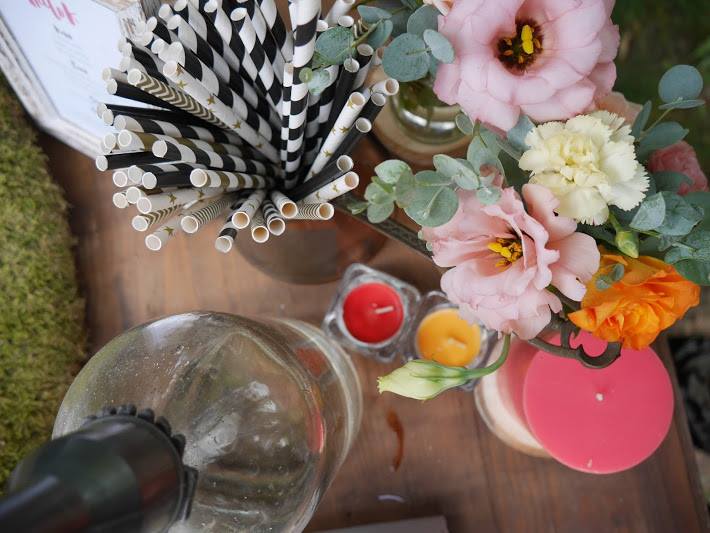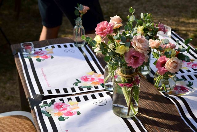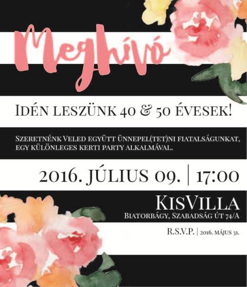 A közös munkánkat az esemény meghívója alapozta meg, amelyet én terveztem. Olyat akartam készíteni, ami egyben férfias, de vannak benne csajos elemek is. Hiszen dupla szülinapozunk, vagy mi a szösz. Így alakult ki a fekete fehér csíkos elegáns design, kis színes akvarell rózsákkal. Ezt a két elemet vittem végig az est dekorációján. Kiki ez alapján állította össze a pompom-, és a virágdekorációt.